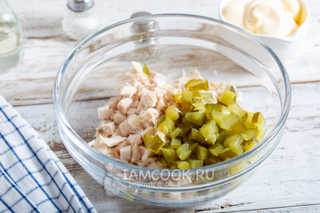 Также нарежьте солёные огурцы.