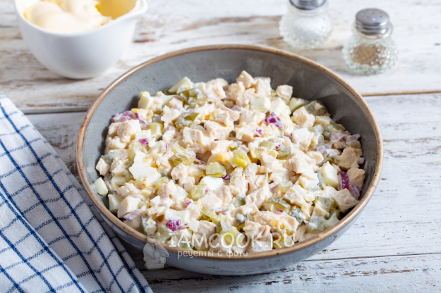 Салат заправьте майонезом, соль - по вкусу. Заправляйте салат щедро майонезом, так как картофель будет суховат сверху, из-за чего салату может не хватить сочности.