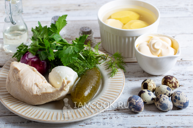 Подготовьте указанные ингредиенты для салата «Гнездо аиста». Яйца предварительно отварите и охладите. Свежую зелень можно взять по своему вкусу. Куриное филе также заранее отварите. Для этого разрезанное филе выложите в кипящую подсоленную воду и варите около 30 минут, сняв пену. Затем мясо остудите.