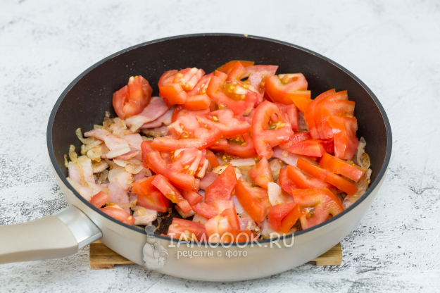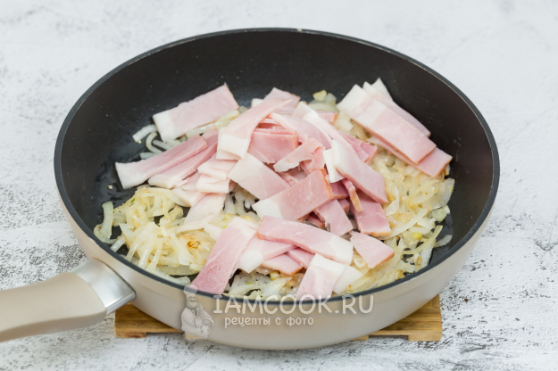 Добавьте нарезанный бекон, жарьте до желаемого.