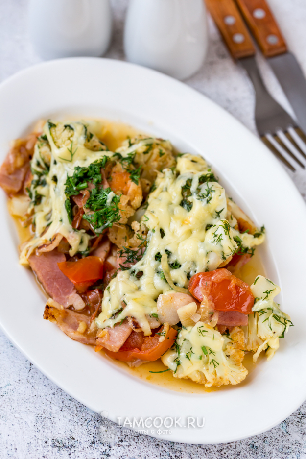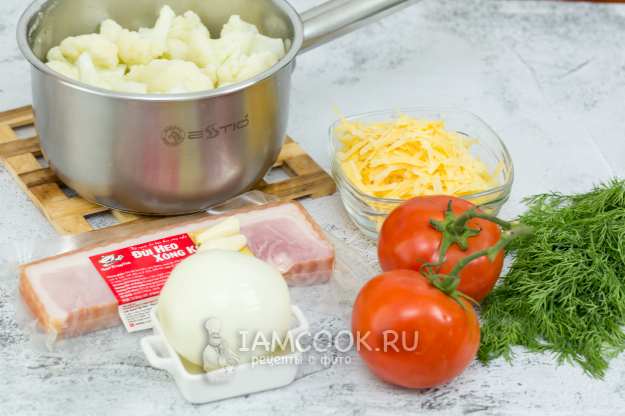Для приготовления цветной капусты с беконом и сыром подготовьте продукты по списку.