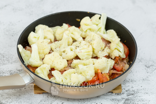 Цветную капусту разберите на соцветия и отварите в течение 30-40 секунд, затем воду слейте.