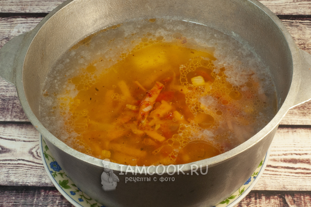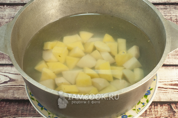 Готовить солянку я снова буду в казане (можно и в кастрюле). Начну с картошки. Наполняем казан водой (берем немного, чтобы солянка получилась густой). Добавляем картофель, чуть присаливаем (не сильно, так как позже мы добавим огурцы, которые дадут дополнительную соль). Ставим на огонь, доводим до кипения и варим на слабом огне под крышкой.