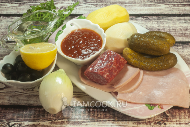 Возьмём ингредиенты для приготовления сборной солянки с колбасой по классическому рецепту.