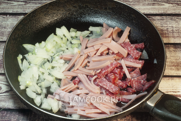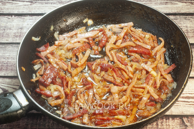 Добавляем к луку всю колбасу и слегка поджариваем.