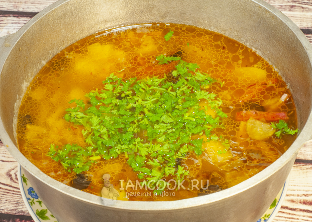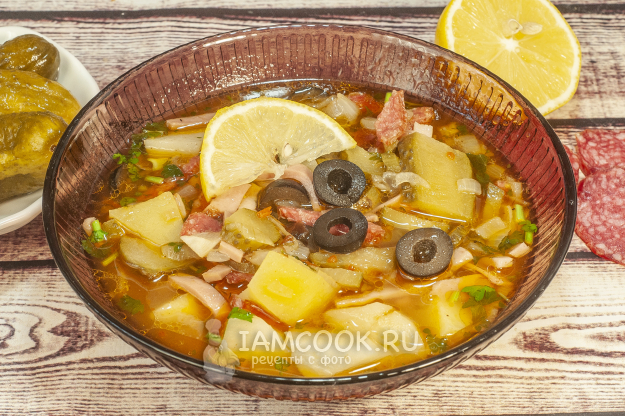 Классическая сборная солянка с колбасой готова. Подаем ее с долькой лимона, по желанию можно добавить сметану.