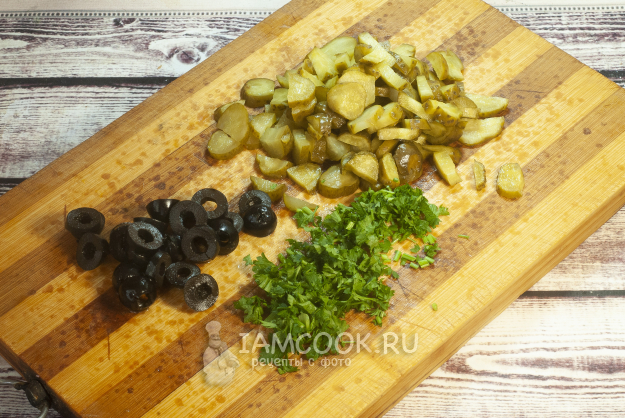 Зелень промываем и нарезаем мелко. Маслины нарезаем тонкими кружочками. Огурчики тоже измельчаем.
