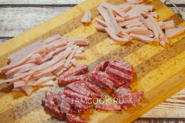 Нарежем колбасные изделия. Нарезка может быть произвольной.