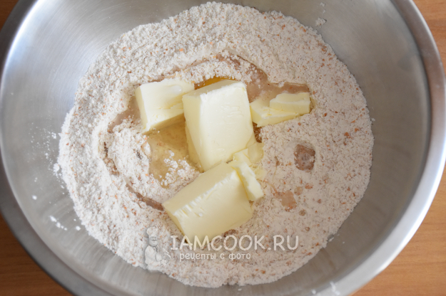 Добавить сливочное масло комнатной температуры, яйцо и ледяную воду.