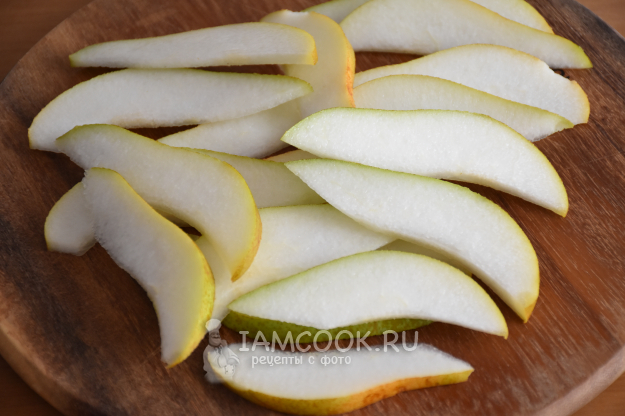 Груши помыть, разрезать на 4 части каждую, удалить сердцевину (кожицу оставить). Затем каждую четвертинку нарезать на тонкие слайсы.
