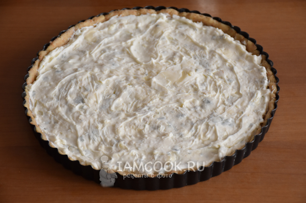Раскатать тесто в круг на 1.5 см больше формы для выпечки, выложить в форму, формируя бортики, и наколоть вилкой по всей поверхности теста. Убрать в холодильник на 30 минут.