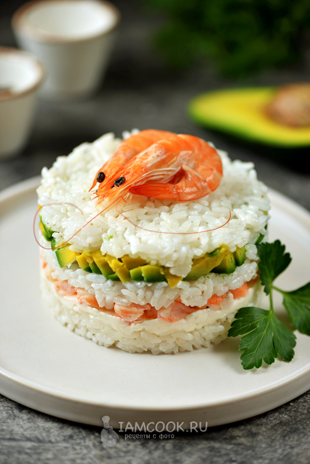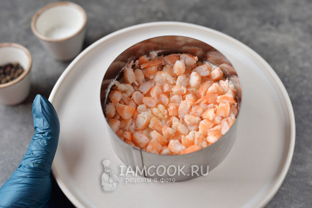 Следующим слоем выложите нарезанные креветочные хвосты, их также покройте тонким слоем вареного риса.
