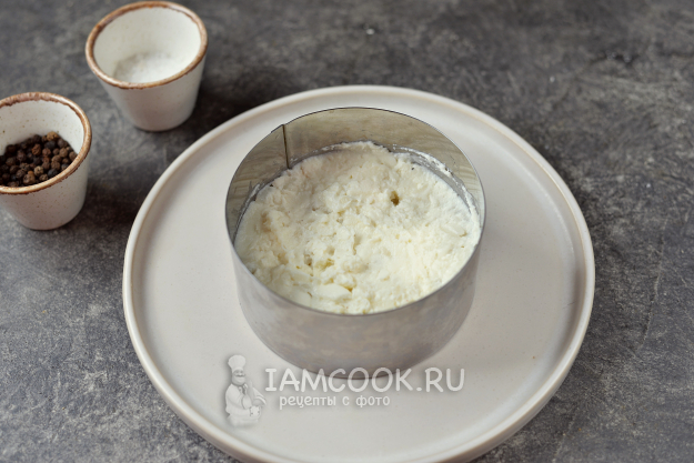 Дальше займитесь сбором салата. Для этого установите сервировочное кольцо в центр тарелки, на которой будете подавать салат. Первым слоем выложите рис, на него положите моцареллу, размажьте сыр по рису тыльной стороной ложки.