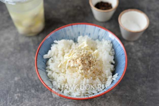 Рис приправьте любимым вкусным майонезом, солью и перцем по вкусу.