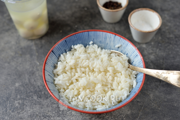 Тщательно перемешайте, отставьте пока в сторону. Заливать рис майонезом не нужно, он и так отлично склеится и будет держать форму.