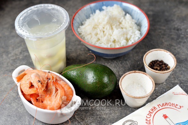 Для приготовления рисового салата с авокадо, креветками и сыром моцарелла нам понадобятся все продукты, что на фото. Рис у меня предварительно отваренный (в пропорции 1:2 с водой - 15-17 минут под крышкой, после чего подержать под крышкой около 15 минут).