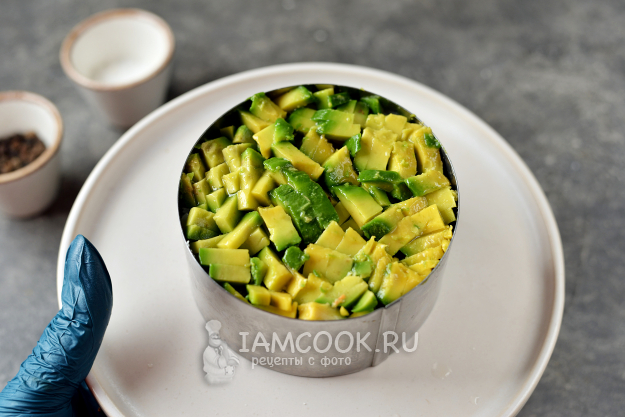 Теперь положите половину спелого, мелко нарезанного авокадо. Если вы используете сорт авокадо, который моментально чернеет, тогда полейте его лимонным соком.