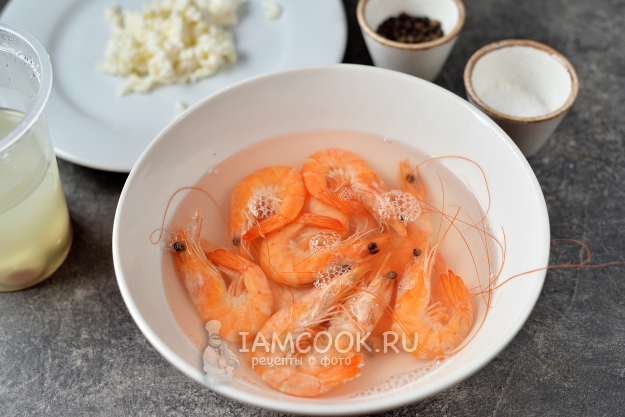 Креветок я купила уже отваренных, поэтому просто заливаю их кипятком и оставляю на минуту-другую. Если же вы возьмете сырых, тогда варите их не дольше 2-3 минут, в зависимости от размера.