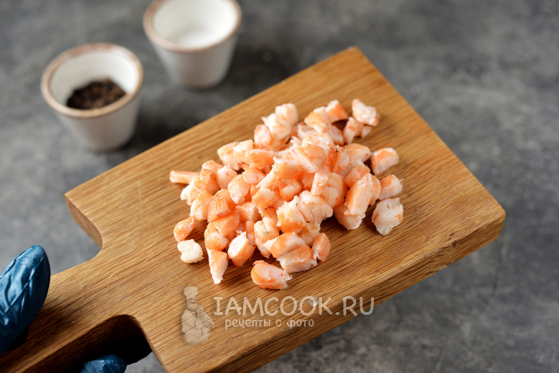 Дальше очистите креветок от панциря, удалите кишечник, нарежьте хвостики небольшими кусочками.