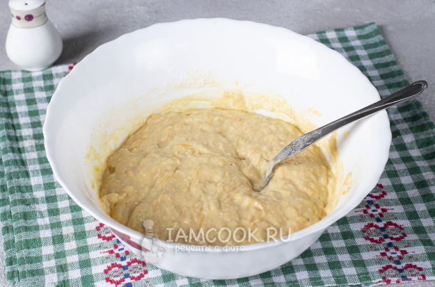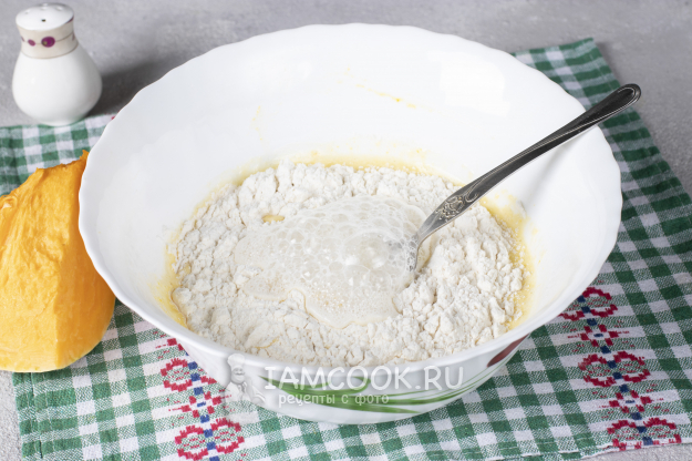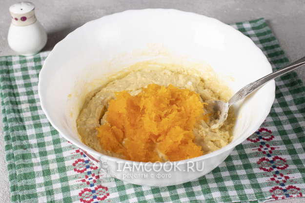 Затем добавить оставшуюся муку и хорошо перемешать всё тесто. Добавить натёртую на мелкой тёрке тыкву.