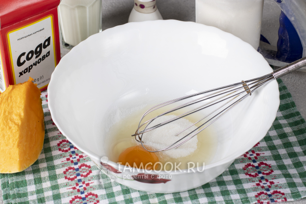 В глубокую миску разбить яйцо, добавить соль и сахар, тщательно взбить венчиком.