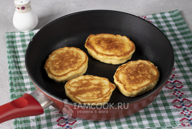 Перевернуть оладьи на другую сторону и также обжарить 1-2 минуты до румяной корочки.