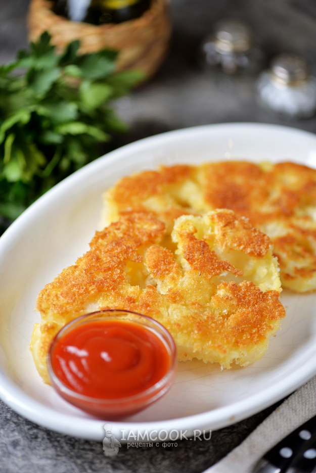 Очень вкусные вегетарианские шницели из цветной капусты готовы! Подавайте с чем угодно - с соусом, с цельнозерновым хлебом, любимым мясом или гарниром.