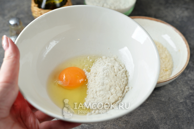 В глубокой миске взбейте крупное яйцо с ложкой муки, хотя я советую добавить чуть больше муки и влить немного молока - кляр получится вкуснее и нежнее. Посолите и поперчите смесь.