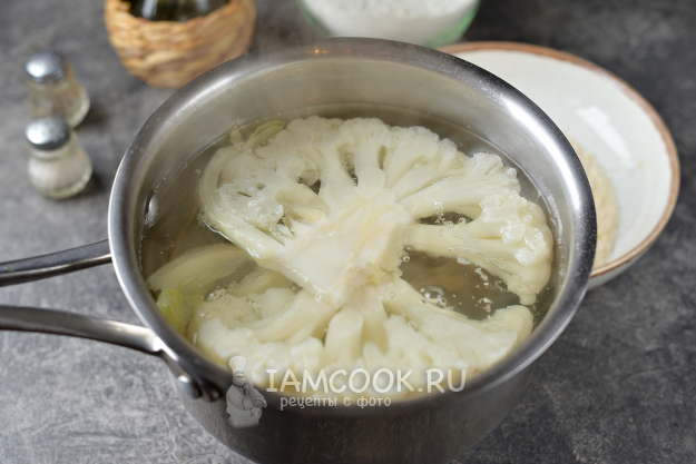 Вскипятите воду, чуть посолите и отварите в ней цветную капусту минут 5, не дольше.
