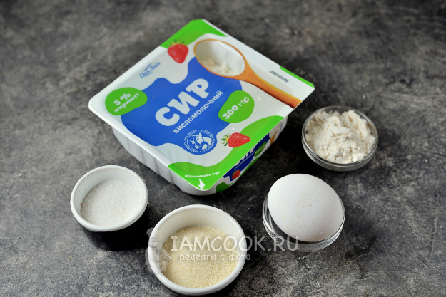 Для приготовления вареных ленивых сырников из творога нам понадобятся все продукты, что на фото. Творог у меня 5%, но подойдет и обезжиренный, и жирный - какой больше любите.
