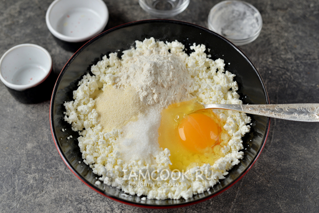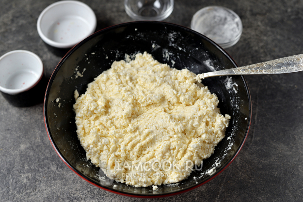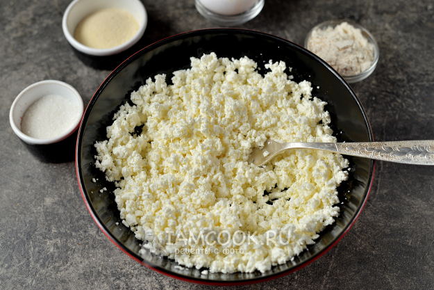 Тщательно отожмите из творога всю сыворотку, в покупном ее обычно слишком много. Переложите творог в глубокую миску, постарайтесь протереть его максимально мелко.