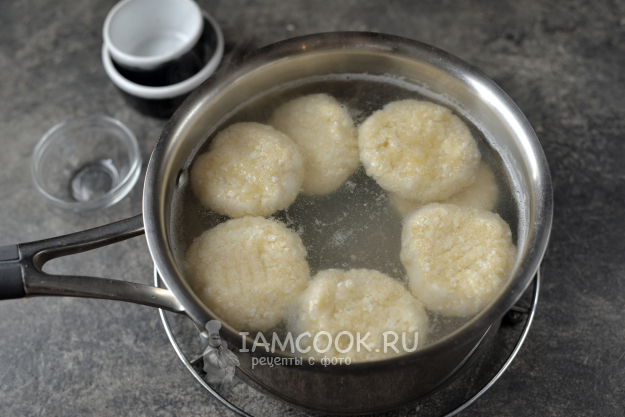 В сотейнике или в кастрюльке вскипятите воду, выкладывайте в нее сырники и варите несколько минут - до тех пор, пока они не всплывут.