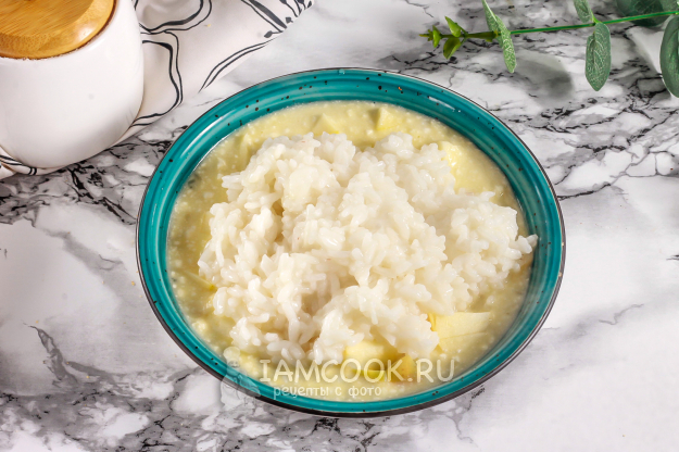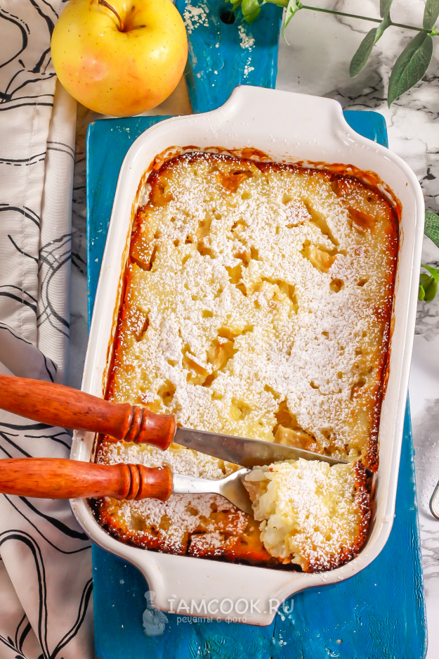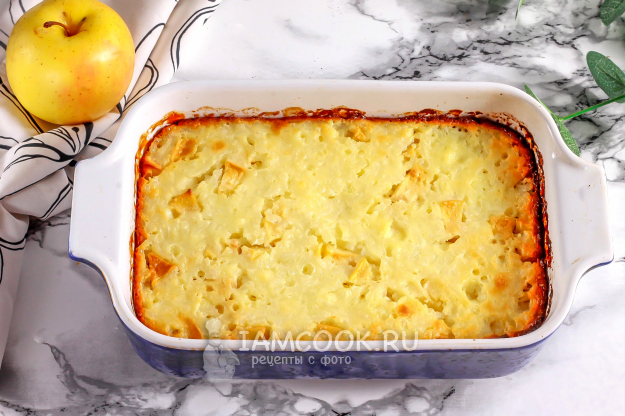 Как только творожная запеканка с рисом и яблоками достаточно подрумянится - она готова. Извлеките форму из духовки и дайте слегка остыть.
