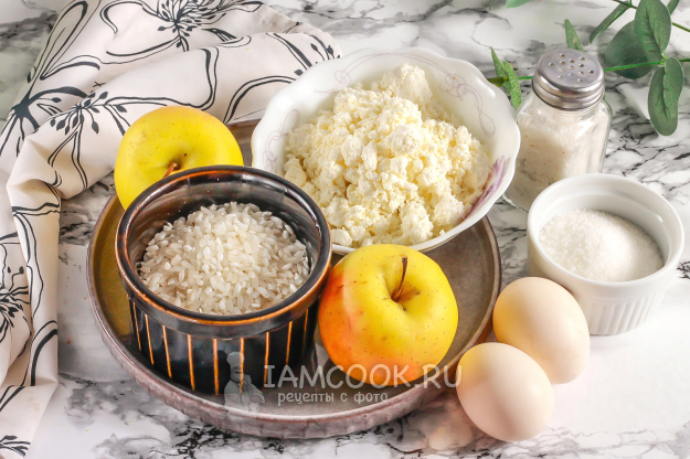 Возьмите необходимые ингредиенты для приготовления сладкой творожной запеканки с рисом и яблоками.