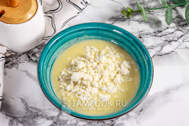 Выложите в массу творог любой жирности и еще раз все взбейте, слегка перетирая творог, чтобы не попадались крупные комочки.