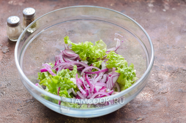 Салатные листья ополоснуть и просушить, порвать руками и выложить сразу в глубокий салатник. Красный лук очистить, сполоснуть и просушить. Нарезать лук полукольцами и добавить в салат.