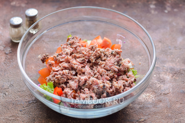 Открыть консервы, сок слить, рыбу размять вилкой и переложить в салат, к овощам.