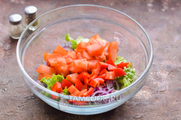 Сладкий перец очистить и сполоснуть, просушить и нарезать небольшими кубиками. Также нарезать помидор небольшими кубиками и переложить в салат.
