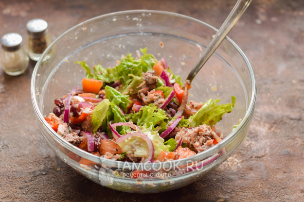 Заправить салат маслом и соевым соусом, всыпать по вкусу соль и перец, все перемешать и подавать к столу - салат с консервированной сайрой и фасолью готов.