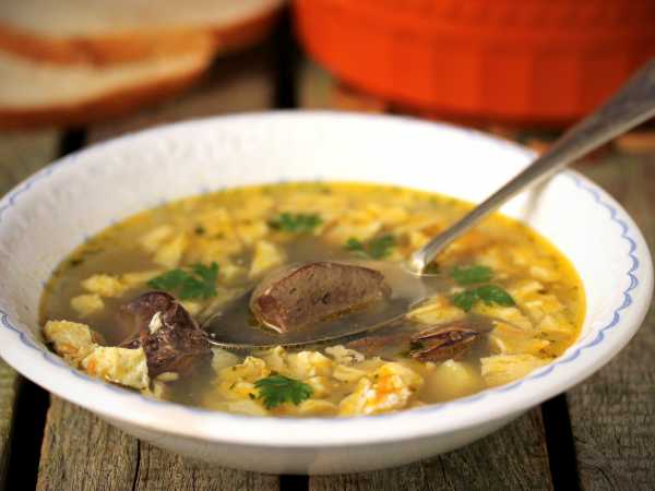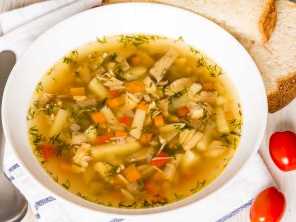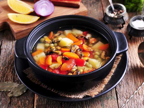 Бульон довести до кипения, добавить в него лук и морковь, варить 10 минут. Если варите суп на воде, то следует добавить в суп лавровый лист и перец горошком.