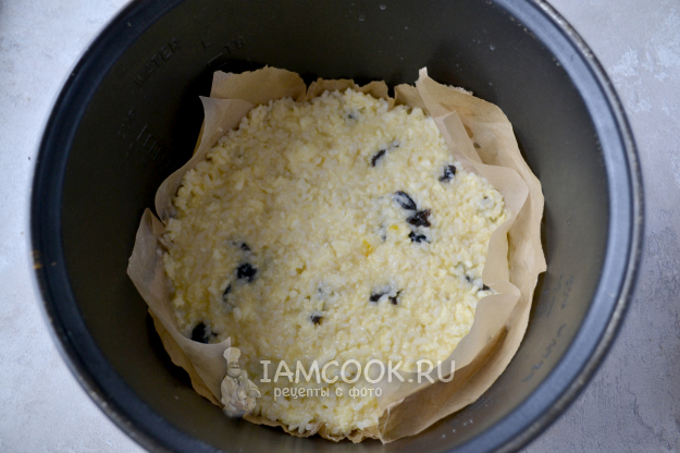 На дно чаши мультиварки положите пекарскую бумагу, смажьте ее растительным маслом и перелейте подготовленную творожно-рисовую массу. Разровняйте поверхность запеканки.