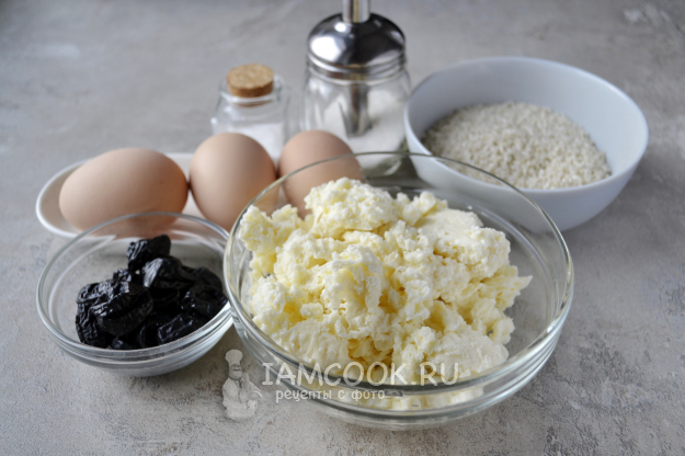 Возьмите продукты для приготовления творожной запеканки с рисом в мультиварке.