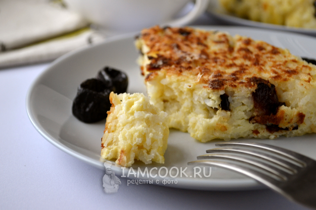 Для творожно-рисовой запеканки возьмите круглый рис и обязательно свежий творог. Добавьте для аромата несколько капель ванильного экстракта. В творожно-рисовую массу можно положить не только чернослив, но и распаренный изюм, кусочки кураги, фиников, инжира.