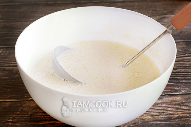 Разведите тесто для блинов. Я сначала смешиваю яйцо с солью и сахаром. Добавляю молоко, размешиваю, затем всыпаю всю муку с содой. Размешиваю до гладкости густое тесто. Затем добавляю кипяток при постоянном помешивании и немного растительного масла. Тесто для блинов готово. Обычно я все готовлю интуитивно, без всяких рецептов, но пропорции написала в списке ингредиентов.