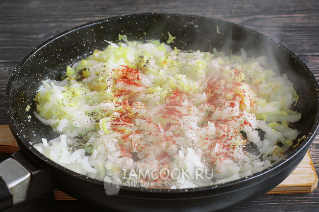 Добавьте в сковороду соль по вкусу и специи. Обжаривайте до готовности начинки.