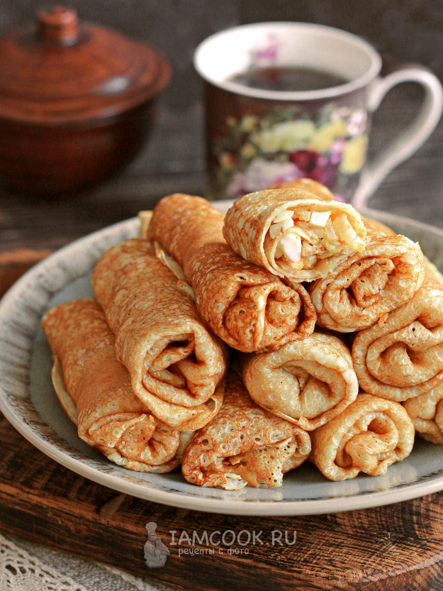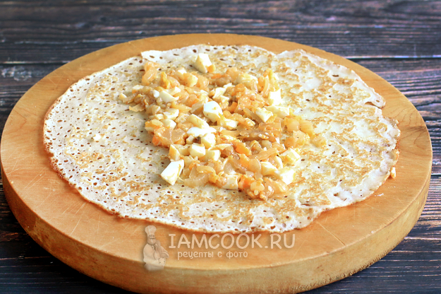 На блин выложите начинку и заверните на нее края блина с двух сторон.