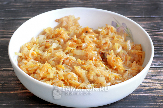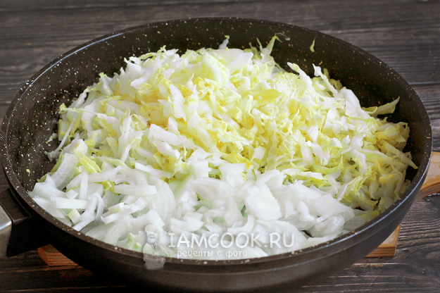 В сковороде разогрейте масло (можно взять смесь сливочного и растительного), обжарьте сначала лук, а затем добавьте пекинскую капусту. Я обжариваю все сразу и вместе, но разделяя в сковороде. Нужно именно жарить начинку, а не тушить ее.