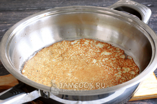 Сковороду хорошенько нагрейте, затем смажьте маслом, и только потом наливайте тесто, распределяя его по всей поверхности сковороды, чтобы получился тонкий блинчик. Обжаренную сторону переверните. Поджарьте все блинчики. Сковороду я смазываю кисточкой через раз, чтобы уж наверняка ничего не прилипло.