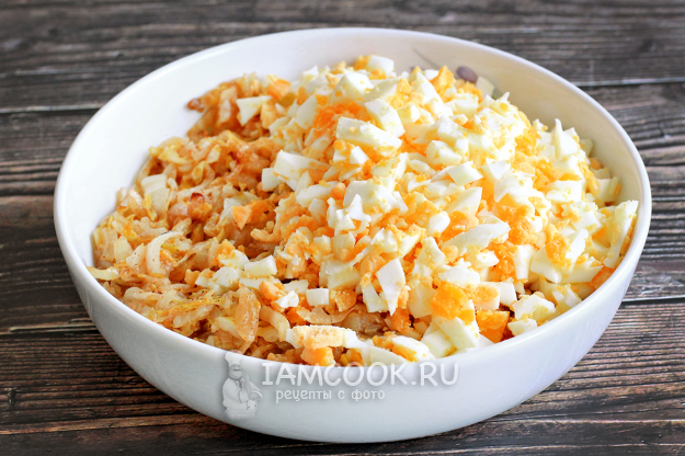 Яйца сразу отварите не более 10 минут, залейте холодной водой, затем очистите и порубите.