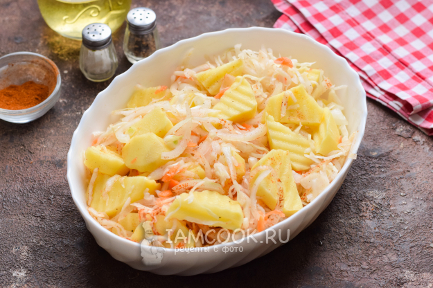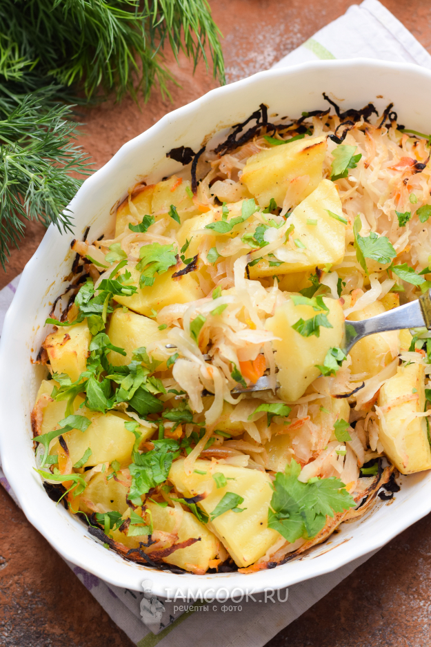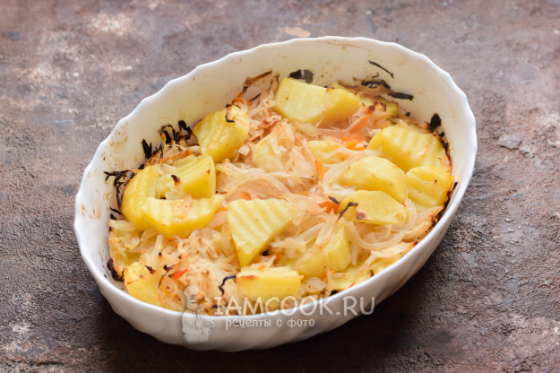 Подготовить жаропрочную форму, переложить в нее капусту и картофель. Запечатать форму фольгой и поставить картошку с квашеной капустой в разогретую до 180 градусов духовку, запекать 45-50 минут.